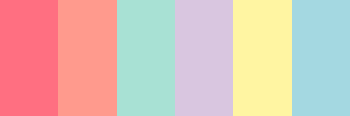 This Bold Pastel Harmony palette features a vibrant pastel pink and coral that add a lively touch, a fresh mint for a refreshing vibe, a soft lavender for a whimsical element, a bright lemon to uplift the palette, and a light ocean blue for a calming effect.