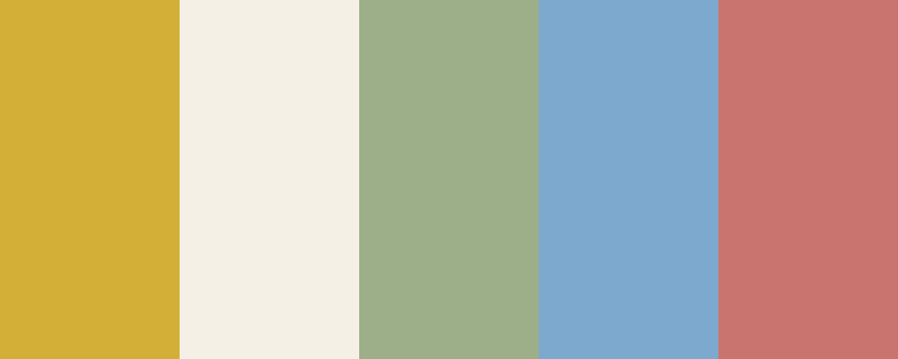 This palette features a harmonious blend of warm earthy tones, combining the richness of gold and terracotta with the softness of cream and the calming effects of sage green and muted sky blue.
