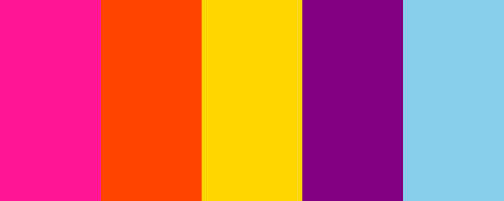 This palette features bold and warm colors reminiscent of a sunset, with hues ranging from fiery oranges to deep purples, balanced by a calming sky blue.