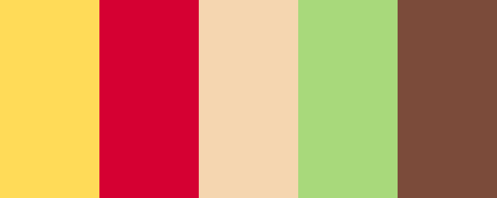 This palette captures the vibrant colors associated with a delicious hotdog, combining the bright yellows of mustard, the rich reds of ketchup, the warm beige of the bun, the fresh green of relish, and the hearty brown of the sausage.