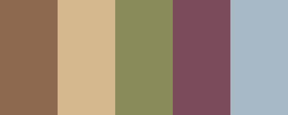 The “Vibrant Earthy Tones” palette features a lively combination of colors that create a warm and inviting atmosphere. The warm brown serves as a solid foundation, while the vibrant beige adds a fresh brightness to the mix. The muted olive and soft plum bring organic depth, and the desaturated sky blue balances the palette with a subtle coolness.