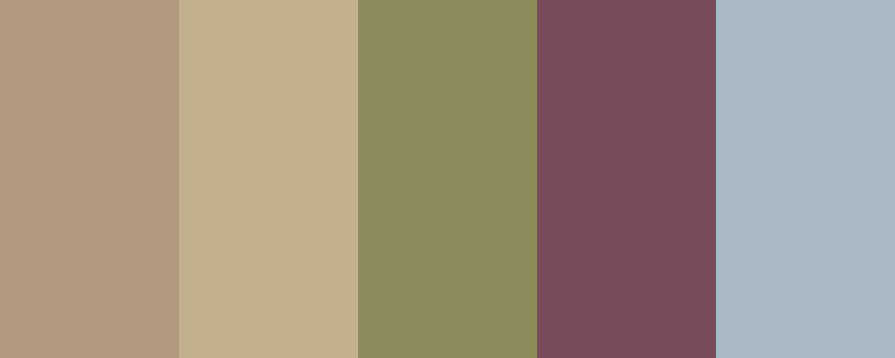 The “Cohesive Warm Earthy Tones” palette features harmonized colors that evoke a sense of warmth and comfort. The warm taupe replaces the previous brown, closely matching the soft yellow beige to create a unified look. The muted olive and soft plum continue to offer organic richness, while the desaturated sky blue provides a calming contrast.