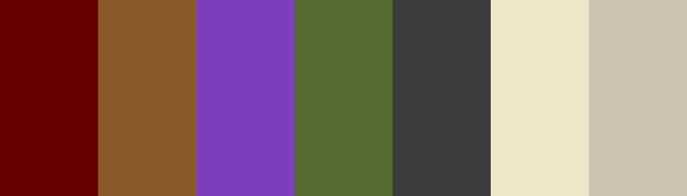 Absolutely! Here’s a new color palette based on the colors you provided: #680000 (a deep red), #8B5A2B (a warm brown), #7D3EBE (a vibrant violet), #556B2F (a dark green), #3C3C3C (a deep gray), #EFE5C7 (a soft cream), and #CDC2B2 (a warm taupe).