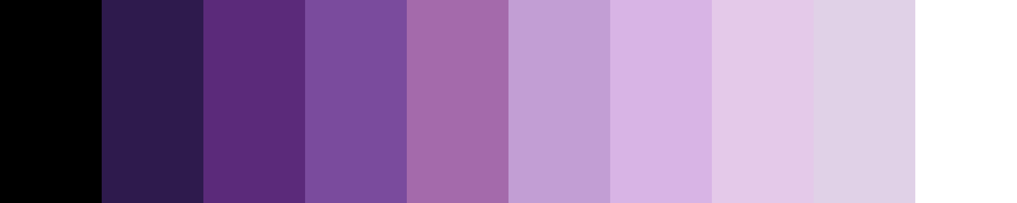 Here’s a refined monochromatic/duochromatic color palette with 10 distinct steps transitioning from a dark desaturated purplish color to the brightest white, ensuring each step represents a clear change in brightness: