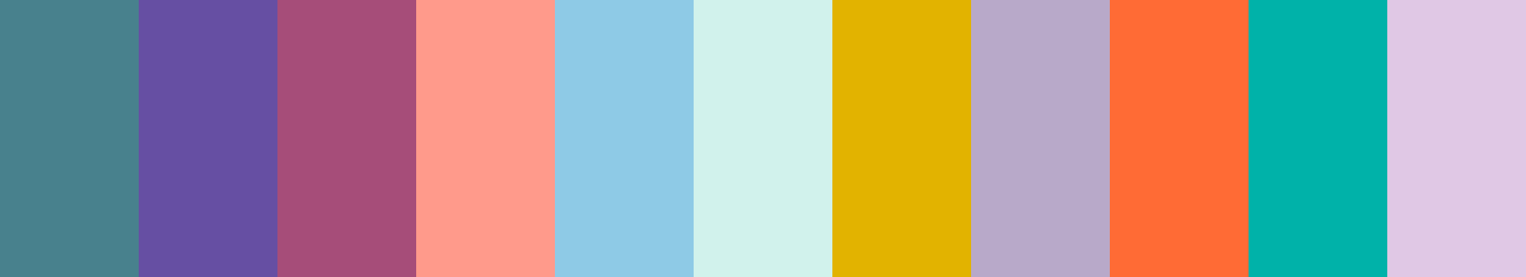 Here is a regenerated 11-color palette based on your request, using #48818d , #664fa3 , and #a64d79 as the base colors, while ensuring all remaining colors are harmonious: