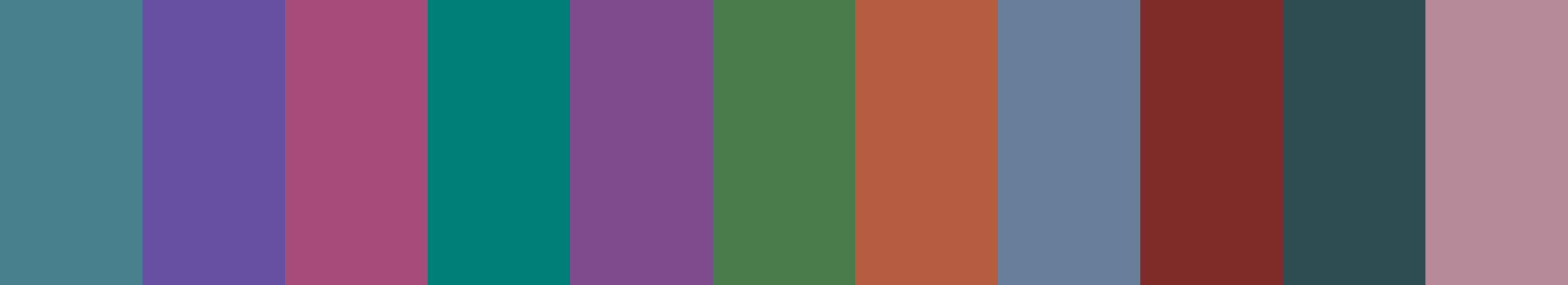 Here is a revised 11-color palette that maintains a similar darkness level to your original colors ( #48818d , #664fa3 , and #a64d79 ) while ensuring harmony: