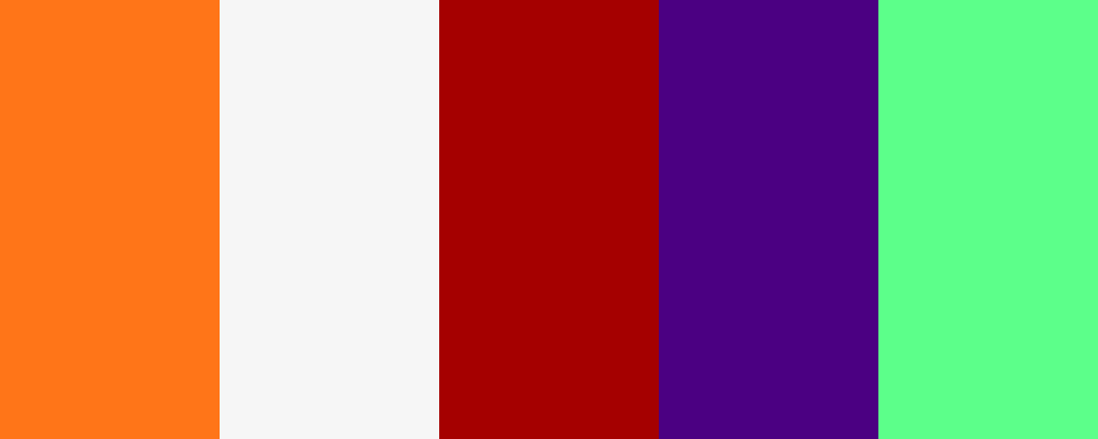 The “Halloween Circus” palette combines festive Halloween colors with the excitement of a circus. Pumpkin Orange brings warmth and energy, while Ghostly White adds an eerie touch. Vampire Red provides a bold contrast, and Midnight Purple deepens the mysterious vibe. Witching Green adds a pop of unexpected brightness, making this palette perfect for Halloween-themed events, decorations, or designs that want to evoke a fun, spooky ambiance.