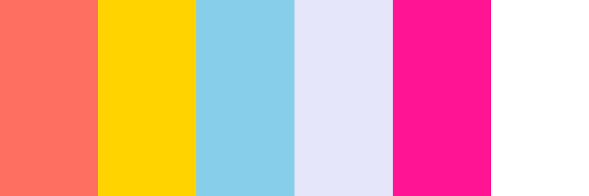 The “Sunset Dreams” palette captures the essence of a beautiful sunset with warm coral and golden yellow hues, complemented by a soft sky blue and a delicate lavender. The addition of deep pink adds a vibrant pop, while white provides a clean contrast that brightens the overall look. This palette is perfect for creating a cheerful and uplifting atmosphere.