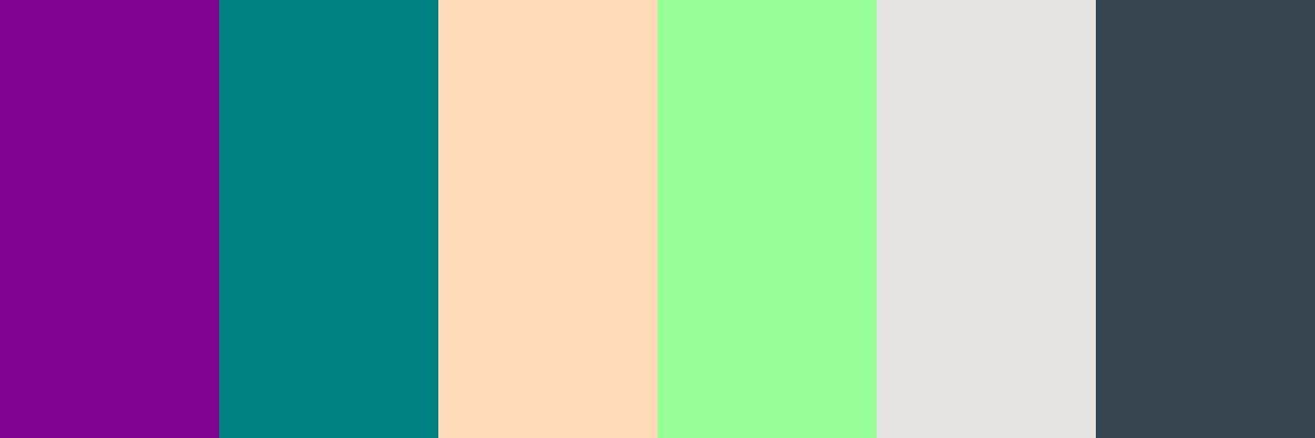 The “Majestic Harmony” palette blends the striking deep purple ( #810490 ) with a serene teal that adds depth. Soft peach infuses warmth and a touch of softness, while mint green introduces a refreshing vibe. Platinum serves as a light neutral to balance the bold colors, and charcoal gray grounds the palette with its understated elegance. This combination creates a sophisticated yet vibrant aesthetic suitable for various design applications.