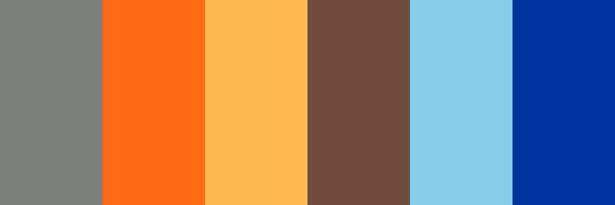 Here is a color palette based on your query, featuring shades of gray, orange, light orange, brown, sky blue, and blue.