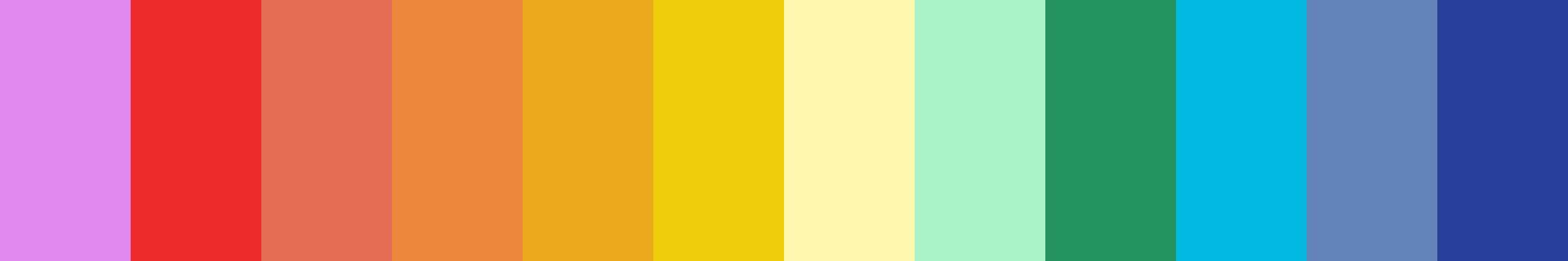 #E18 Bef, #Ed2 B2 B, #E56 E52, #Ee873 E, #Ecab1 F, #Efcc09, #Fff7 Ad, #Aaf2 C8, #25935f, #03b8e1, #6283b8, #2a419c