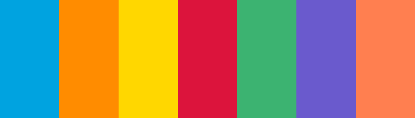 This palette features seven distinct colors that are easily distinguishable from each other and are specifically chosen to be colorblind-friendly, avoiding the use of white, black, or brown.