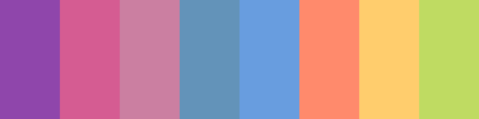 This arrangement transitions from the darker, cooler shades of purple and teal to the brighter, warmer colors like coral and yellow-green. Would you like any further adjustments or additional palettes?