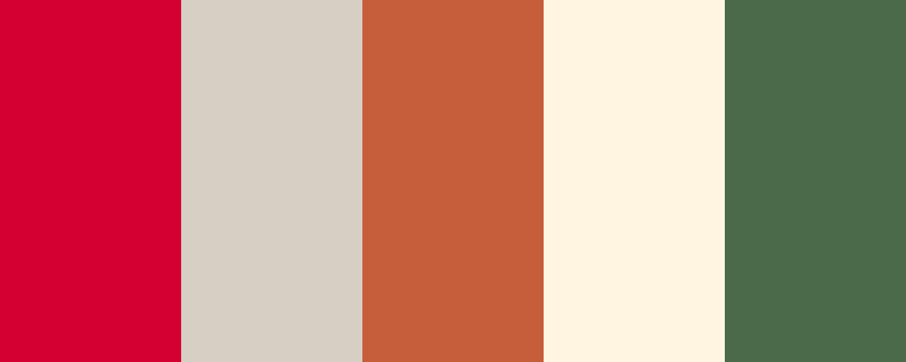This palette features a bright Cherry Red for a striking accent, complemented by Warm Taupe and Rustic Orange to create a cozy, inviting atmosphere. Soft Cream adds brightness, while Moss Green introduces a touch of nature, enhancing the overall warmth.