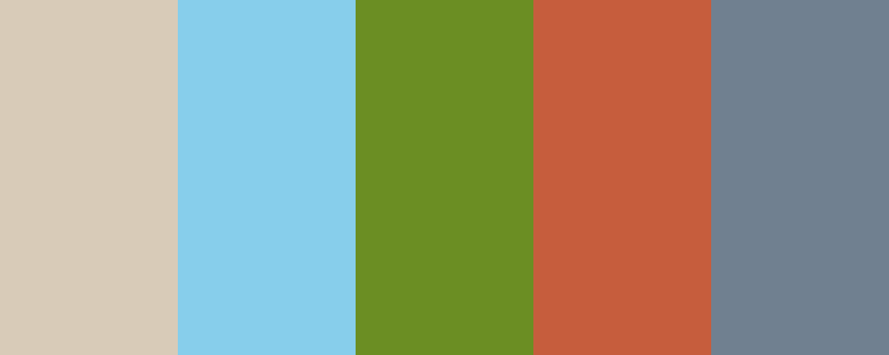 The “Suburban Serenity” palette combines warm beige to evoke a cozy, welcoming feeling. Sky blue represents the open spaces, while olive green brings in a touch of nature. Rust orange introduces a hint of rustic charm, and slate gray adds a modern touch that ties the palette together.