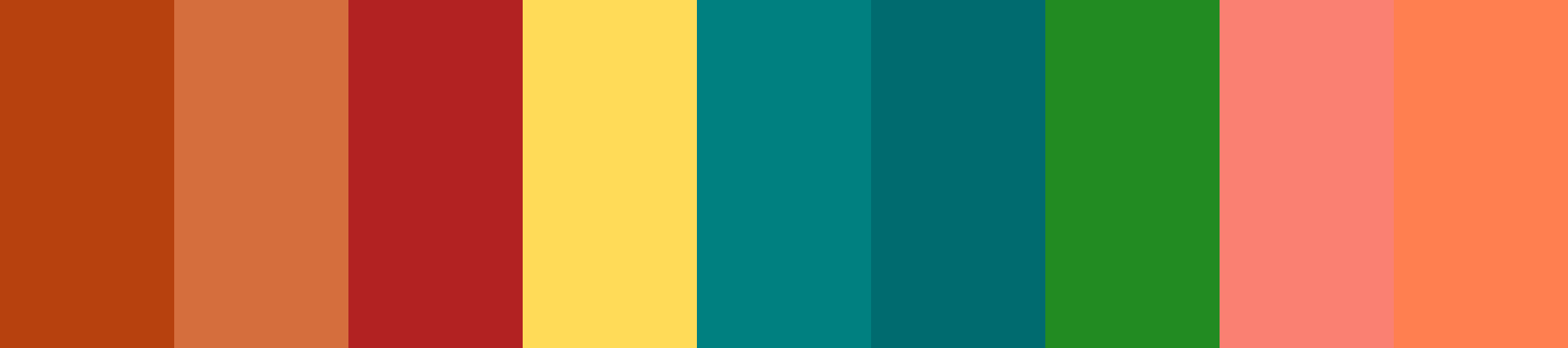 Here’s a color palette inspired by Rust, Terracotta, Brick Red, Mustard, Teal, Petrol Blue, Forest Green, Salmon, and Coral: