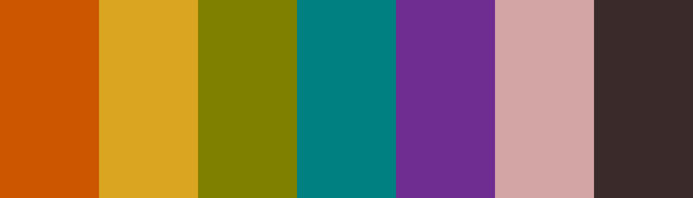 Here’s a color palette inspired by Burnt Orange, Golden Mustard, Olive Green, Teal Blue, Plum, Dusty Rose, and Dark Brown:
