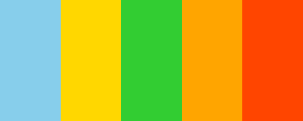 Here is a color palette based on your request for โCalm and Hopeโ featuring blue, yellow, green, orange, and red: