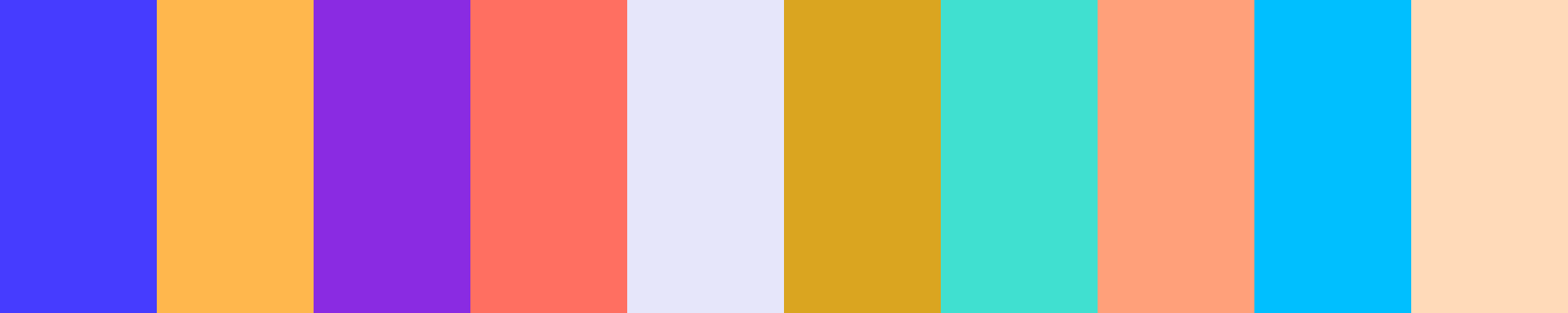 Here is a distinct 10-color palette that incorporates both #463CFF (deep blue-violet) and its complementary color #FFB74D (warm yellow-orange) along with additional colors for variety: