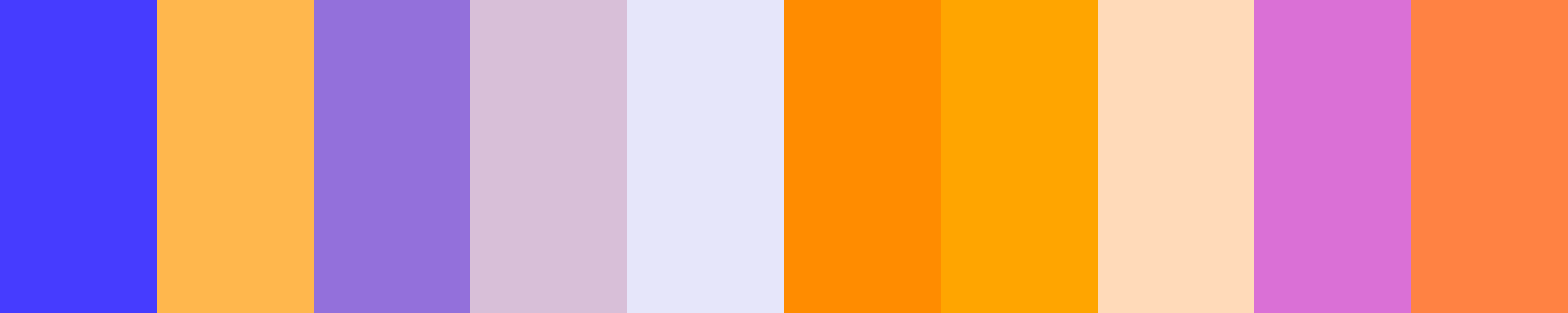 Here is a distinct 10-color palette featuring various shades of purple and orange, including #463CFF (deep blue-violet) and #FFB74D (warm yellow-orange):