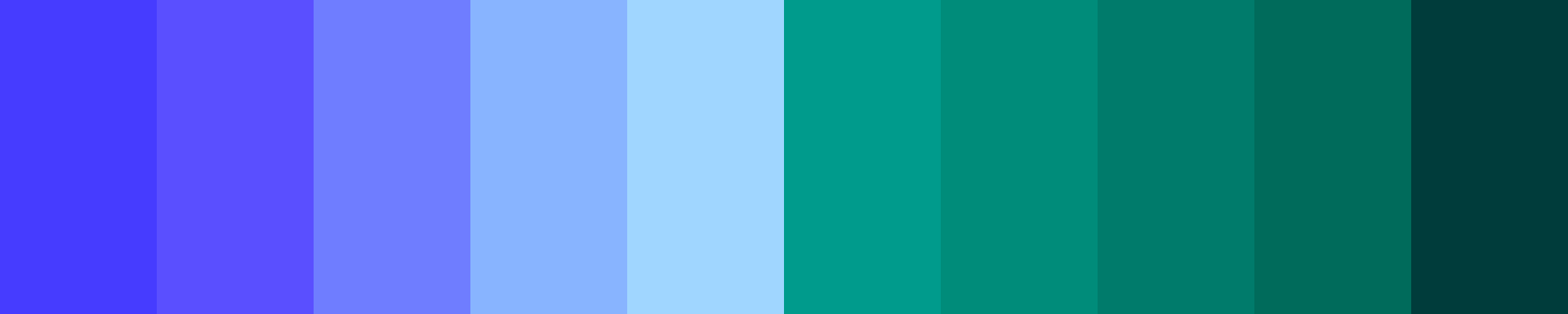 Here’s an updated 10-color gradient palette with enhanced distinctiveness between each color while transitioning from #463CFF (deep blue-violet) to #003C3B (rich teal):