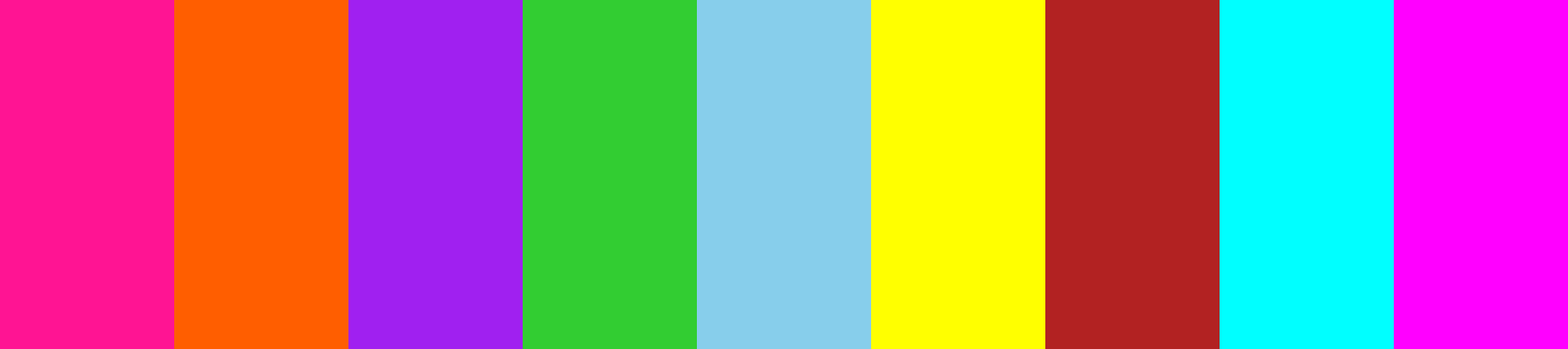 This palette embodies the spirit of a vibrant playground filled with neon colors, perfect for creating fun and eye-catching designs. Would you like to explore ideas for using this palette in a project or learn about color psychology related to these colors?