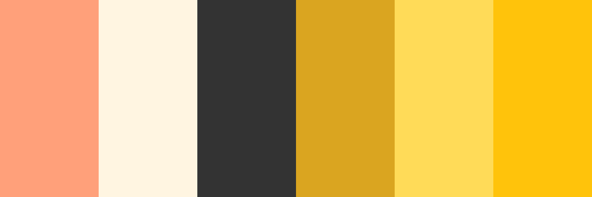 This palette retains your selected colors of Light Salmon ( #FFA07A ), Light Cream ( #FFF5E1 ), and Charcoal ( #333333 ). The new yellow options—Goldenrod ( #DAA520 ), Mustard Yellow ( #FFDB58 ), and Honey Yellow ( #FFC30B )—are all rich and warm, complementing the natural vibe of the original colors while providing excellent contrast for titles against images.
