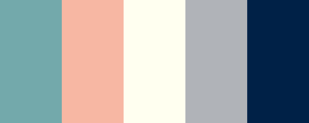 The “Teal Serenity” palette features a beautiful teal as its base color, complemented by soft coral for warmth, creamy white for balance, muted gray for neutrality, and deep navy for depth. This combination creates a tranquil and harmonious aesthetic that can be used in various design projects.