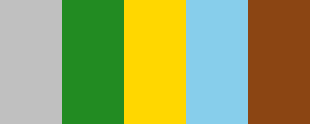 This palette includes shades of silver to represent the flowing streams, greens for the forests, gold for the meadows, a soft blue for the sky, and earthy brown to ground the palette.
