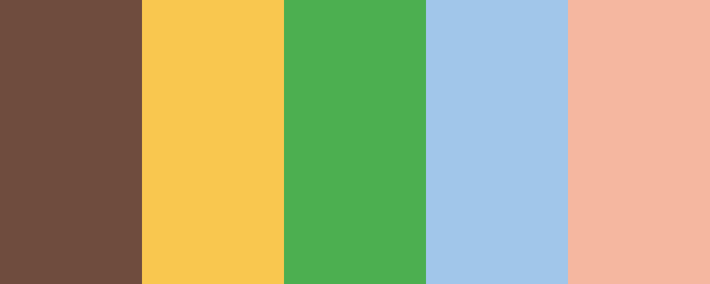 This palette features earthy brown tones reminiscent of squirrels, complemented by warm yellows and greens that evoke the feel of a sunny garden. The soft peach adds a gentle touch, while the sky blue brings in a refreshing contrast.