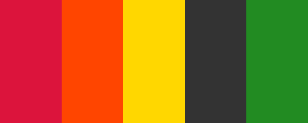 This palette features a bold combination of deep red and fiery orange, evoking warmth and intensity, complemented by luxurious gold to add a premium touch. Charcoal black serves as a strong background, while fresh green brings a refreshing contrast to the overall design.
