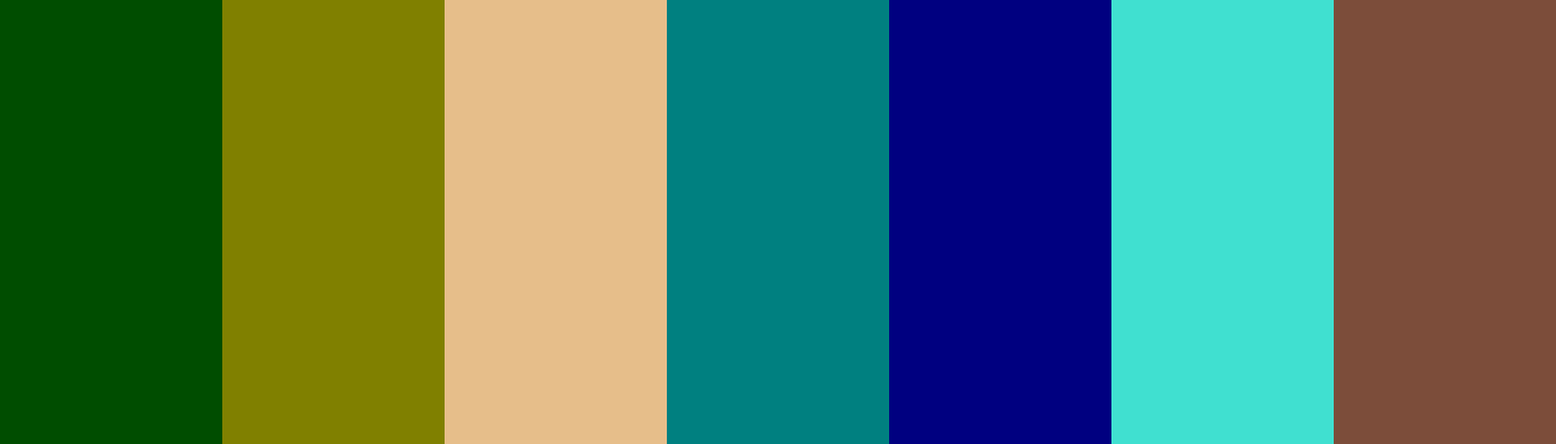 The “Earthy Elegance” palette features a harmonious blend of deep and muted tones inspired by nature. The deep dark green and olive represent lush foliage, while the pale gold adds a touch of warmth. Teal green and turquoise evoke the tranquil waters, and navy provides a strong foundation. Reddish brown introduces a rustic element, making this palette ideal for projects that aim for a grounded yet sophisticated aesthetic.