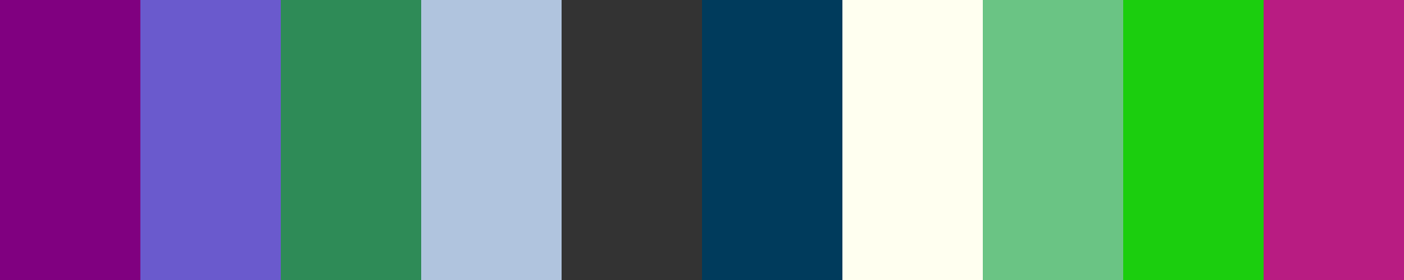 Generated using Quick Palette Generator. Colors included: Purple ( #800080 ), Warm Blue ( #6A5ACD ), Later Gator ( #2E8B57 ), Supremely Cool ( #B0C4DE ), Carbon ( #333333 ), Poseidon ( #003B5C ), Ivory ( #FFFFF0 ), Generated ( #6AC484 ), Monstrous Green ( #1BCE0E ) and Generated ( #B81C82 ).