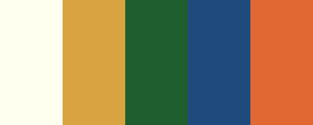 Generated using Quick Palette Generator. Colors included: Ivory ( #FFFFF0 ), Curry ( #D9A440 ), Pine ( #1F5E2E ), Night Mode ( #1E4A7E ) and Bronzed ( #E16832 ).