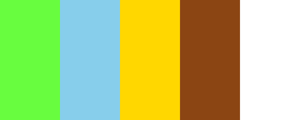 This palette features a vibrant fresh green to represent new growth, a soft sky blue for the spring sky, a bright sunshine yellow to evoke warmth, earthy brown to ground the palette, and floral white to symbolize blooming flowers.