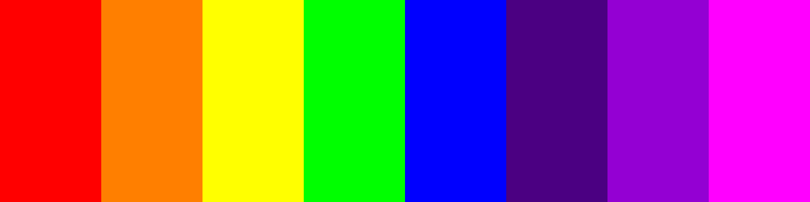 Here is a vibrant 1970s Rainbow color palette, following the ROYGBIV order:
