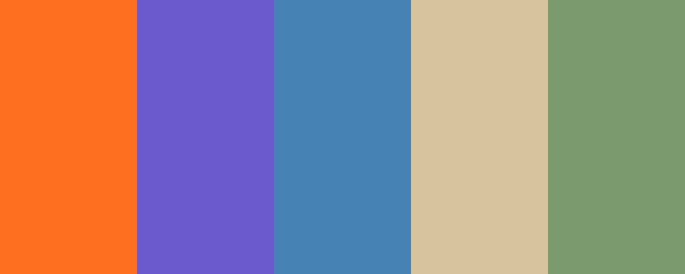 This palette captures the essence of a summer evening with warm oranges reminiscent of the setting sun, calming purples and blues to reflect the twilight sky, and earthy greens and sandy tones that ground the palette in nature.
