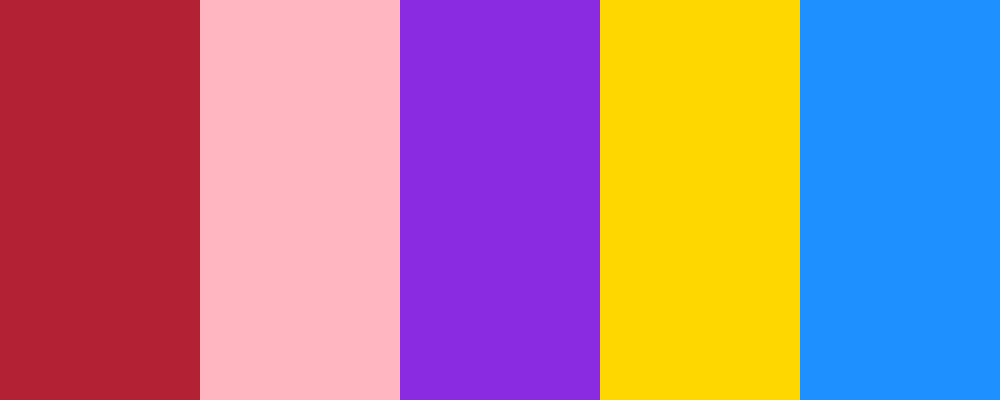 This palette features a vibrant crimson red that symbolizes passion, soft pink for warmth and affection, deep violet for mystery and depth, golden yellow for optimism and cheerfulness, and ocean blue for tranquility and balance.
