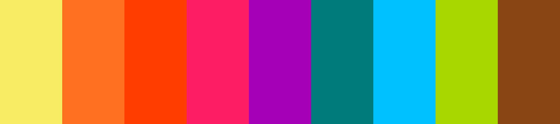 Here is a color palette inspired by the vibrant and iconic colors of the 1970s rainbow theme, featuring 9 colors: