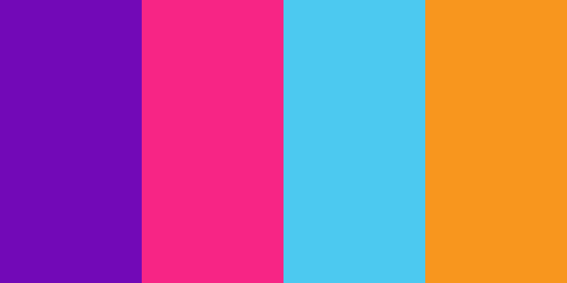 This palette features vibrant and contrasting colors that can be used to create an energetic and lively design. The deep purple and fuchsia pink provide a bold foundation, while the sky blue and sunset orange add a refreshing and warm touch.