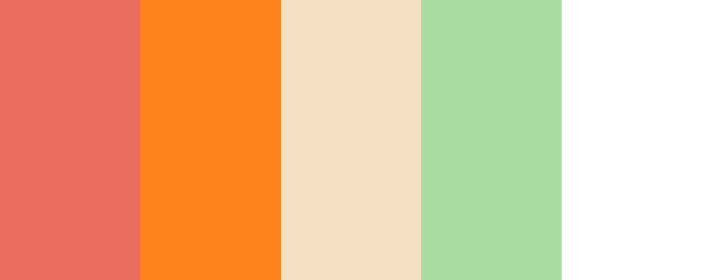 This palette combines warm and vibrant colors with soothing neutrals. The coral and bright orange serve as energetic base colors, while soft beige adds a touch of warmth and comfort. Fresh green symbolizes health and vitality, and classic white brings clarity and a clean finish.