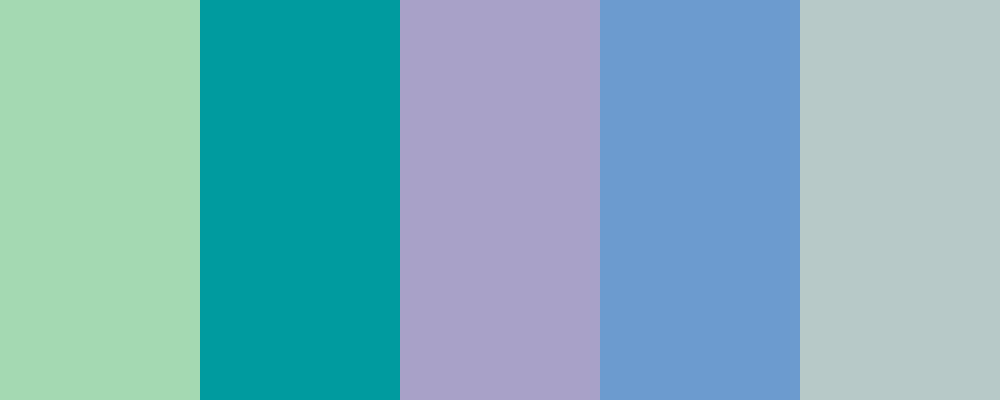 The “Ethereal Mystique” palette features a soft mint green ( #A4D9B2 ) as the base color, complemented by a mysterious cyan ( #009B9F ) that adds an enigmatic touch. The addition of dusty lavender and whispering blue provides depth and richness, while moonlit gray adds a subtle elegance, creating a balanced and magical atmosphere.