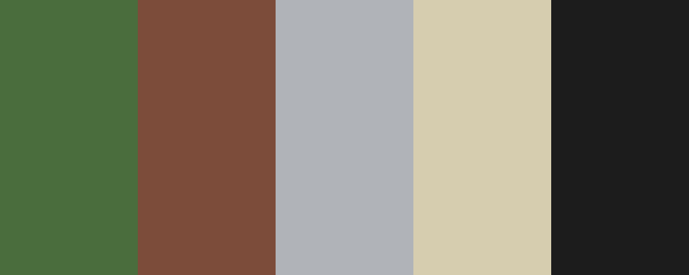 This palette reflects the earthy tones and metallic shades often seen in military environments. The colors can be used for various designs, including digital art and game interfaces.
