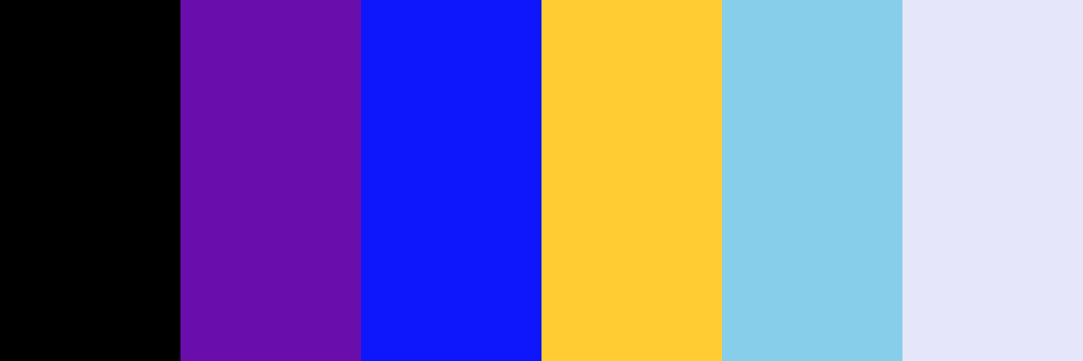 This palette features the rich deep purple, bright blue, and cheerful sunny yellow, complemented by black as a neutral base. The additional shades of sky blue and lavender provide a versatile range for various applications.