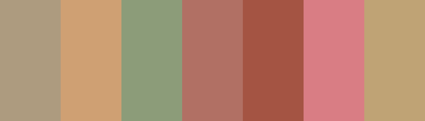 #Ad9 B7 F #Cfa073 #8 C9 C79 #B17064 #A45443 #D97 D84 #Bfa375