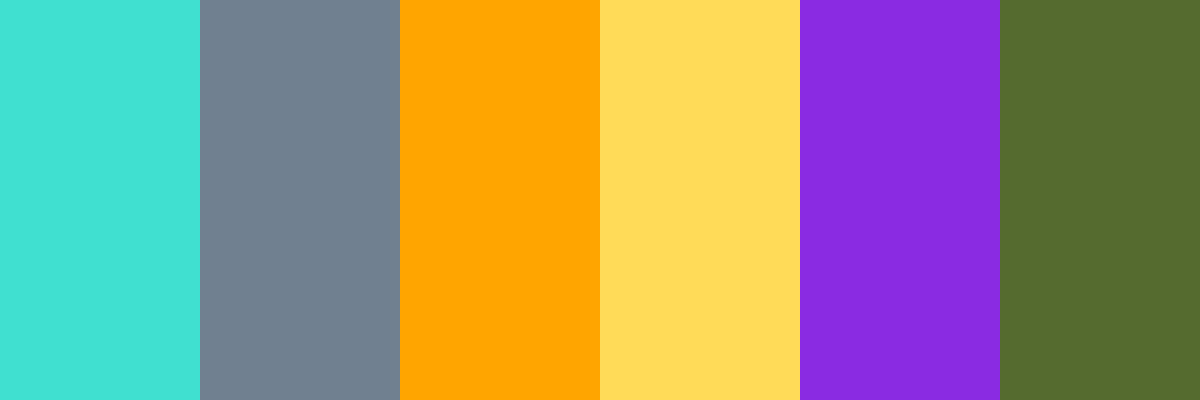 Turquoise: #40 E0 D0 Sunset Orange: #Ffa500 Mustard Yellow: #Ffdb58 Deep Plum: #8 A2 Be2 Olive Green: #556 B2 F
