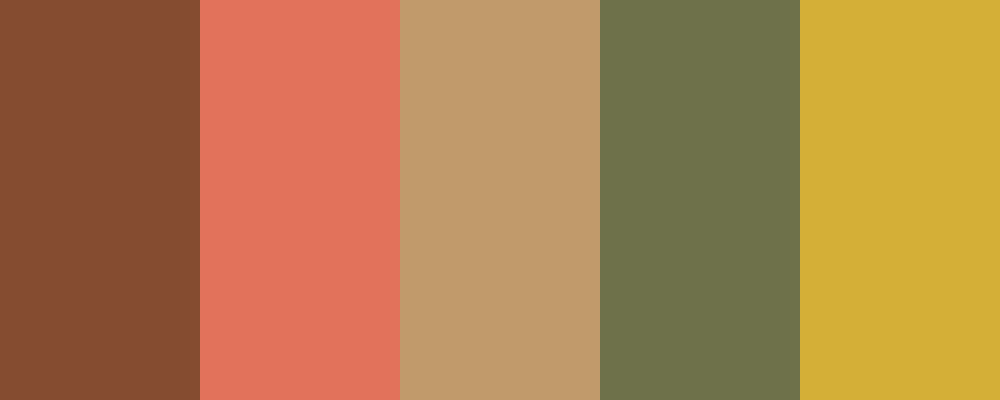 Rich Brown: #854C30 Terracotta: #E2725B Camel: #C19A6B Olive Green: #6E714A Mustard: #D4AF37