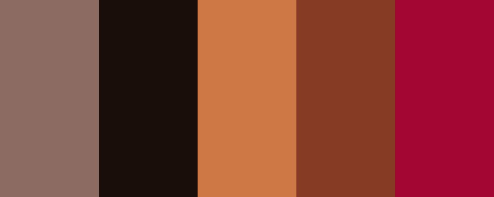 #8C6B60 #CE7846 #853B24 #1A0E0A #A30531