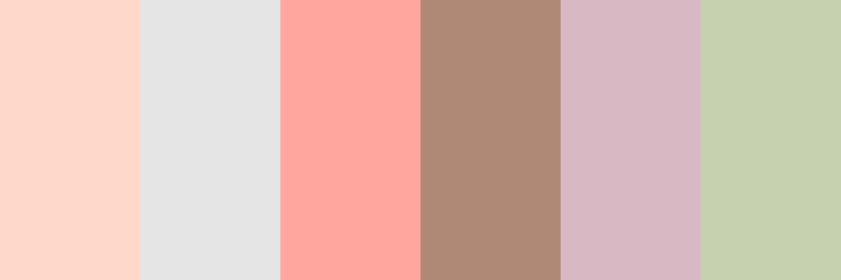 Soft Peach (#Fed9 C9) Light Coral (#Ffa69 E) Warm Taupe (#B08876) Soft Lavender (#D8 B9 C3) Pale Sage Green (#C6 D1 B0)